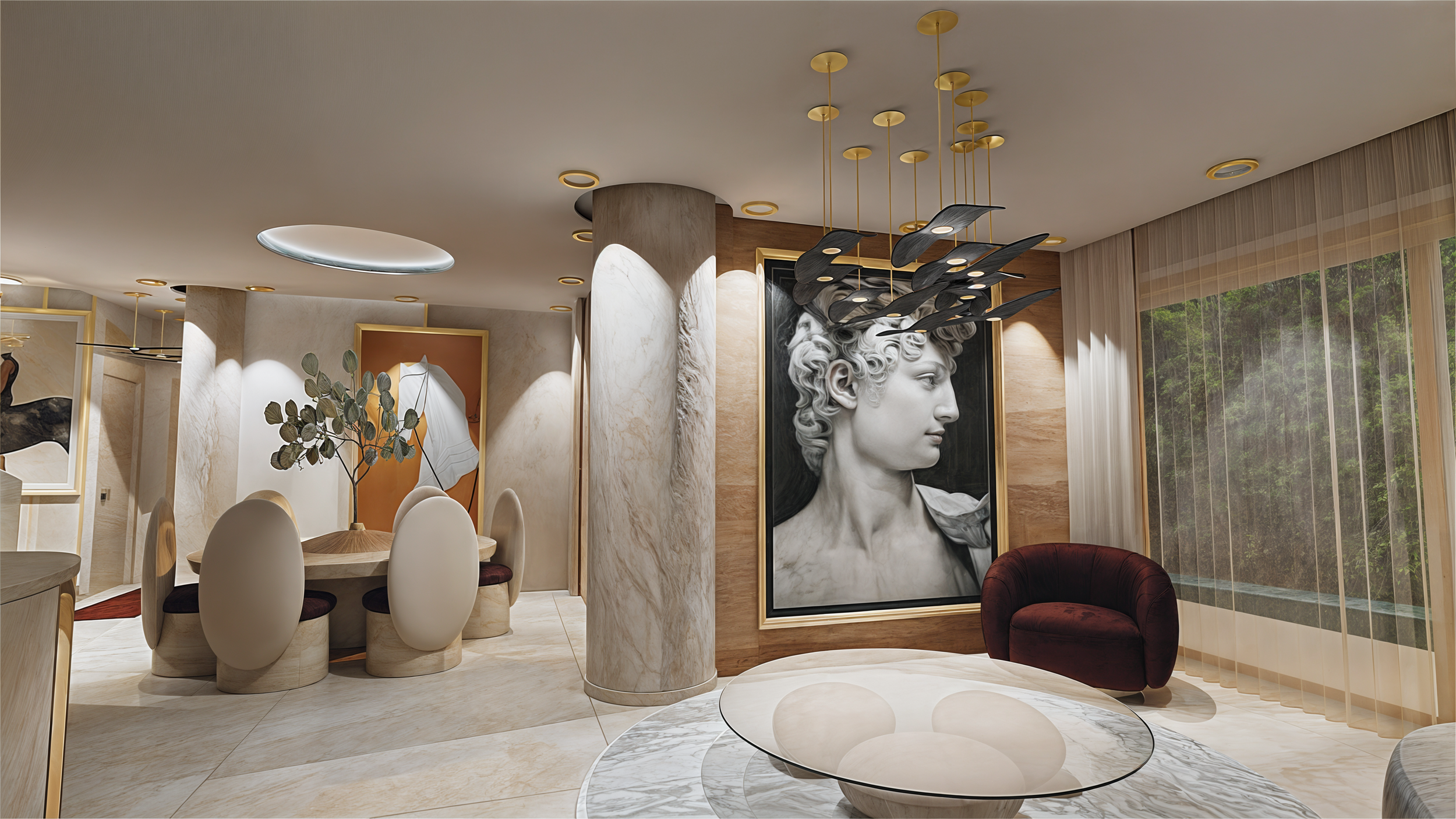 Ügyfelem, külföldi hazaköltözése miatt vásárolt ingatlant, így azt szerette volna, ha otthona itt is képviseli azt a luxust, amit az Egyesült Arab Emirátusokban töltött ideje alatt megszokott. A projekt során kiemelt szerepet kapott az elegancia és a természet közelsége, amely tökéletes harmóniában jelennek meg az enteriőrben. A híres tervezők által készített darabok külön figyelmet kaptak, emelve a tér exkluzivitását. A konyha egyediségére is nagy hangsúlyt fektettünk, hogy az otthon ezen része is a prémium minőséget és dizájnt képviselje. Az ingatlan minden egyes részlete gondosan megtervezett, így az otthon egy valódi ékszerdoboz lett, amely minden igényt kielégít, így megőrzi a luxusérzetet.